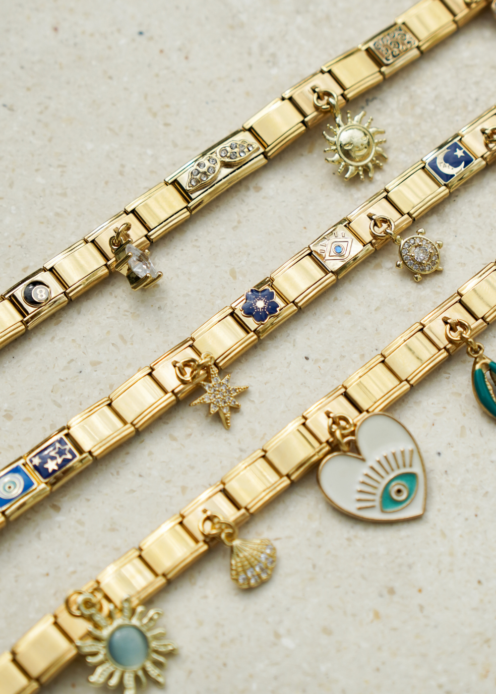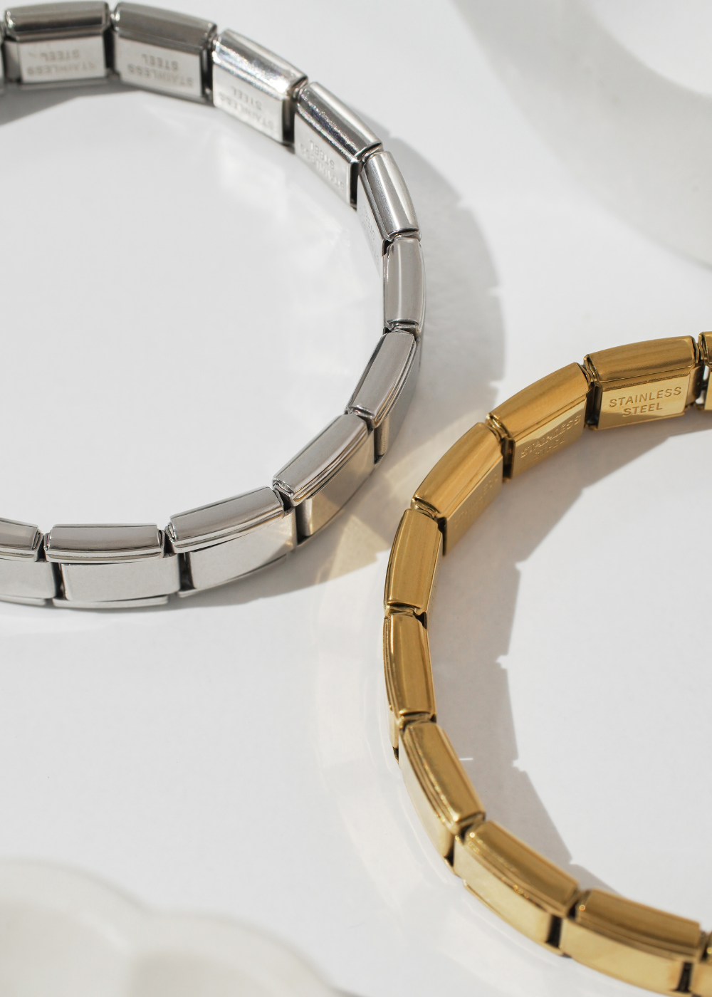 Choose your bracelet: SILVER, GOLD, OR ROSE GOLD. A bracelet is made up of 18 links (without charms). It adapts to your wrist by removing or adding links.