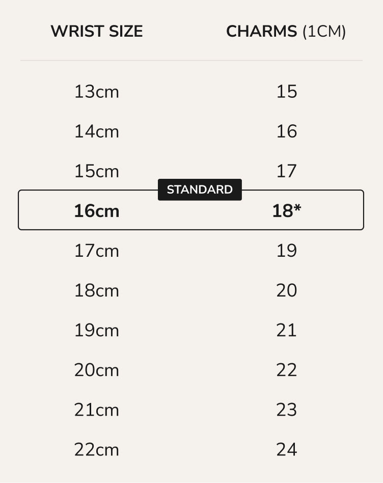 Size Guide: Our bracelets come in a one-size design featuring 18 uniform charms* to fit most wrists. You can easily add or remove charms to adjust the length and ensure a perfect fit for your wrist.